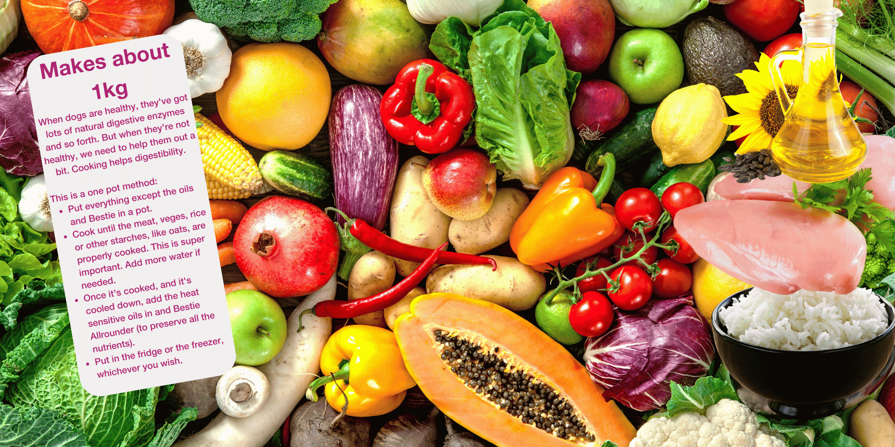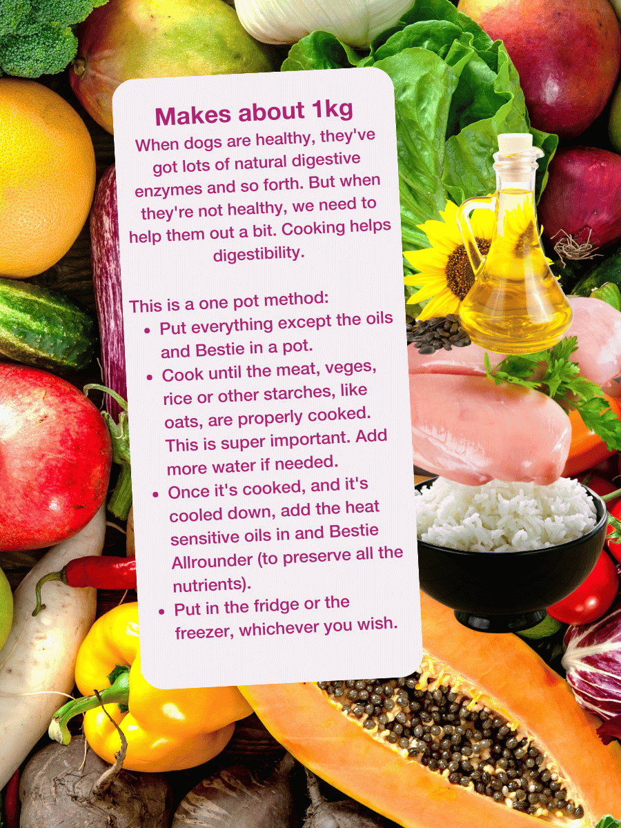 The diet includes lean chicken breast and chicken liver, which are high-quality, easily digestible protein sources. This helps to provide essential amino acids without overburdening the digestive system.